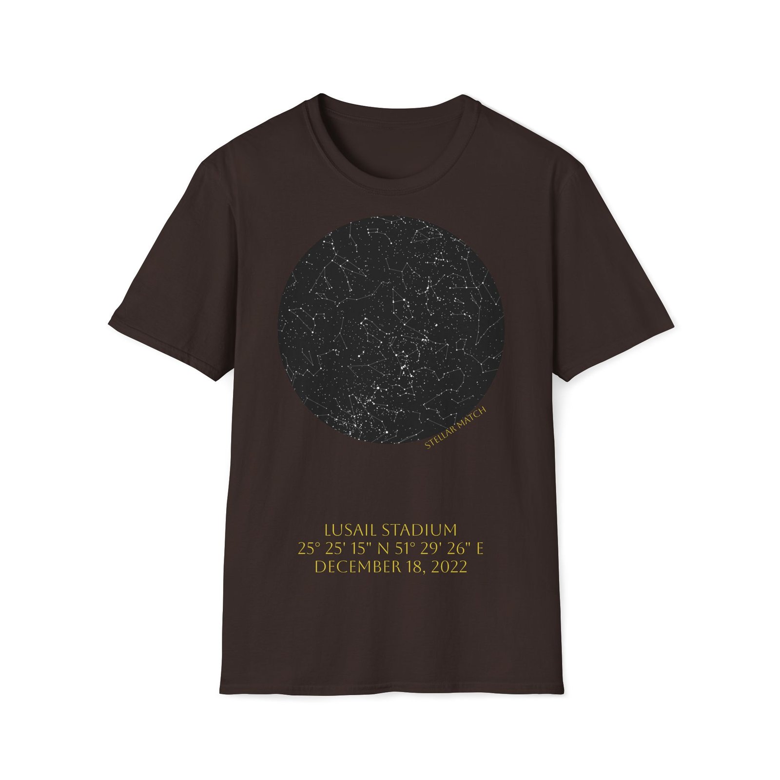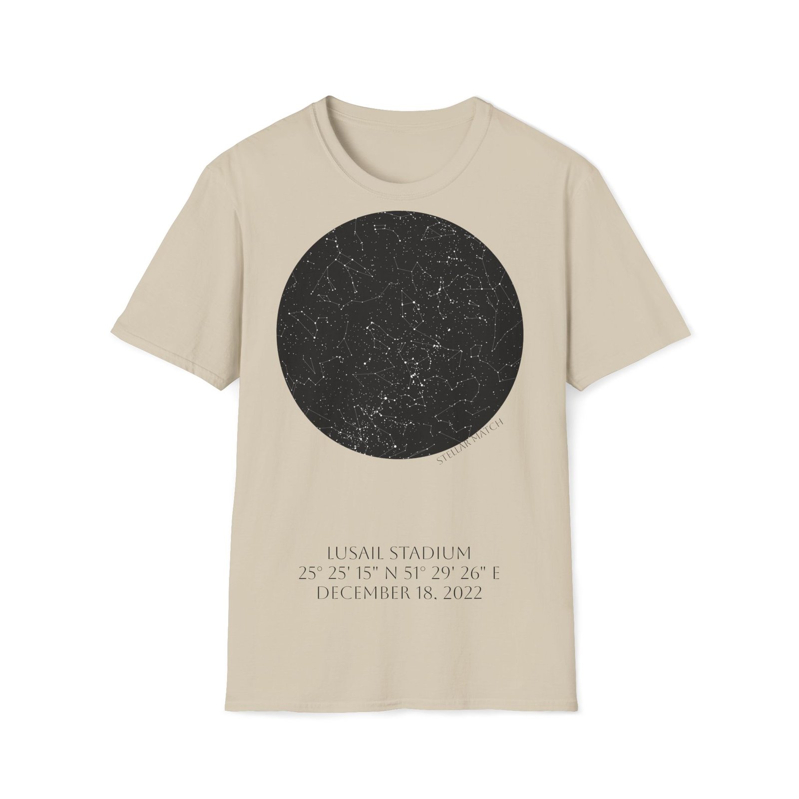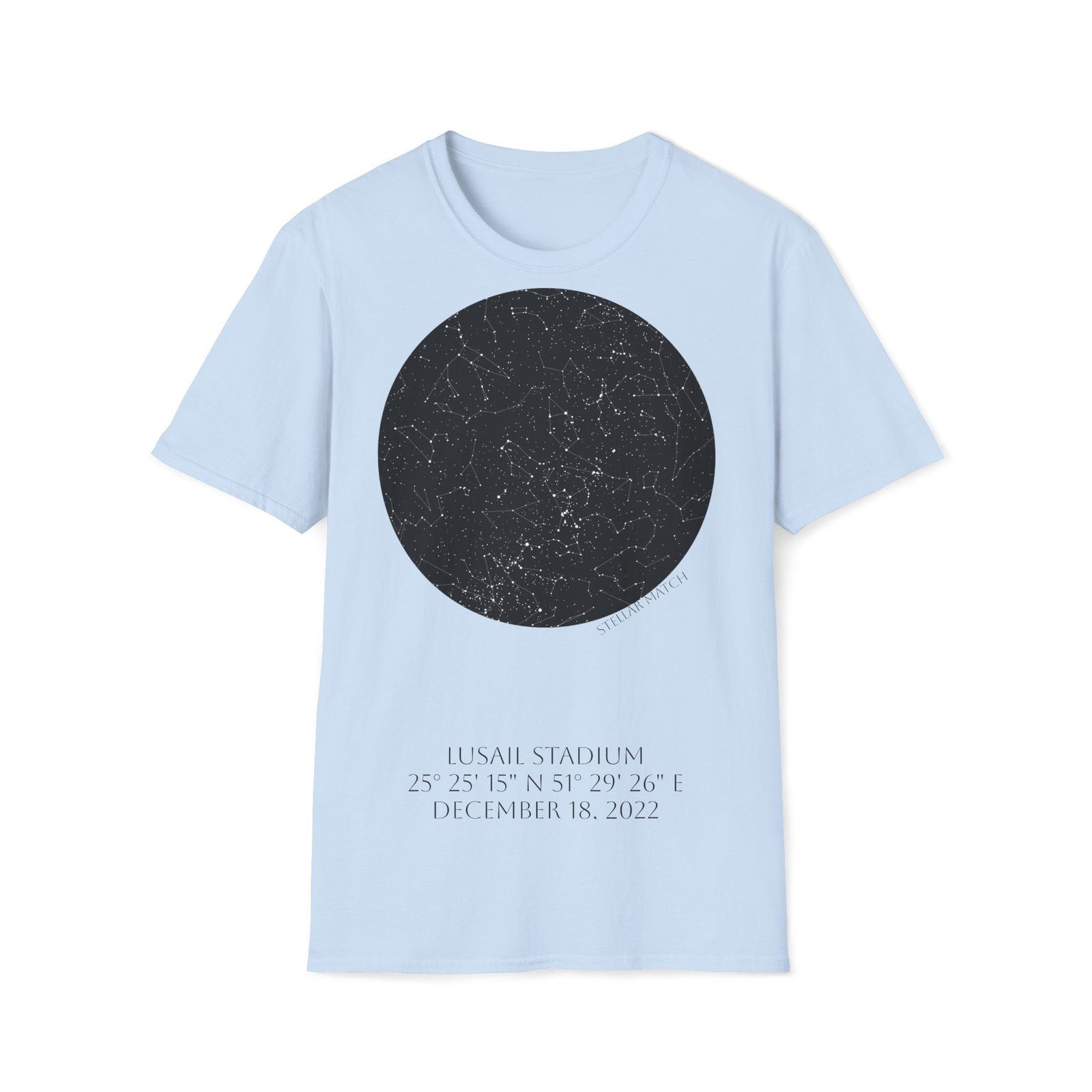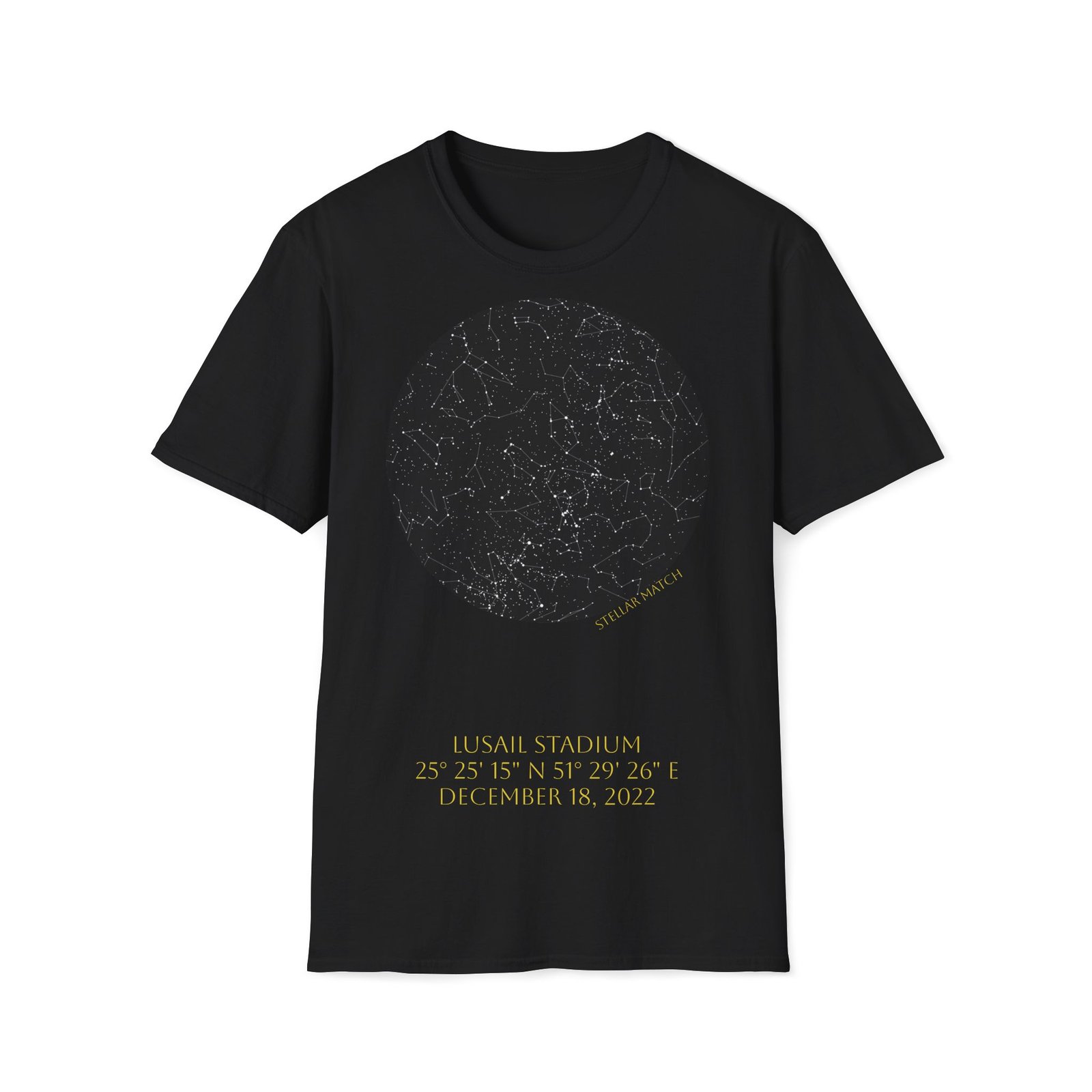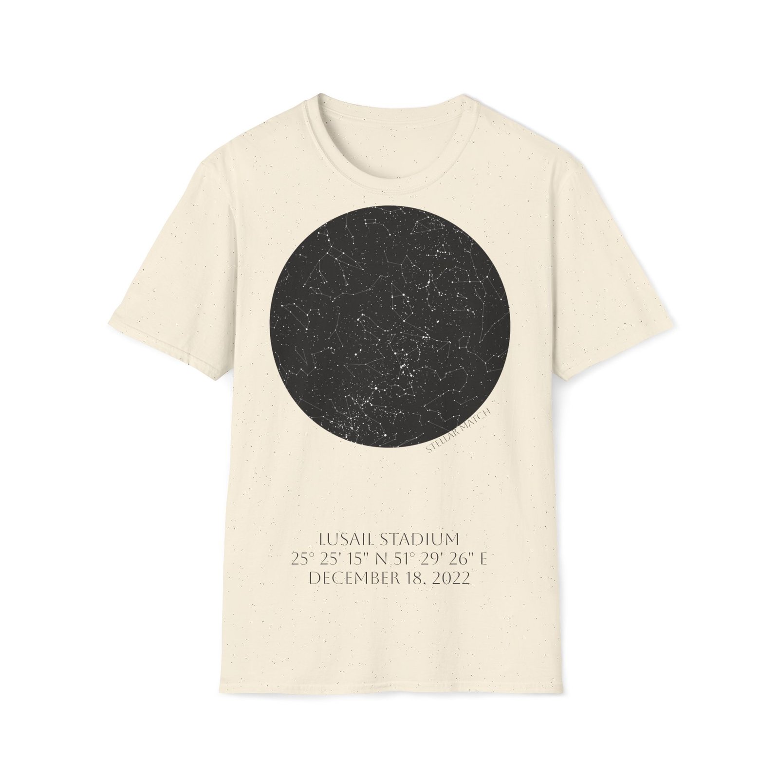 This design captures the exact celestial alignment over Lusail at kickoff — mapped precisely by date, time, and geographic coordinates. The front features the star map from that historic night, while the back (optional version) marks the defining scoring moments that shaped the match.